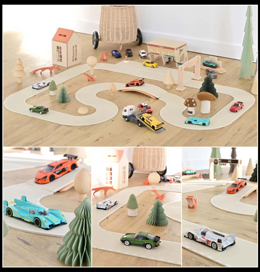 Circuit de course pour miniatures 1/43 Circuit de course pour petites voitures composé de 18 pièces souples en silicone Utilisable en intérieur et en extérieur - Livré avec une Audi R18 bleue 1/43 Stands et grille de départ - Plus de 4 mètres de route Norev T43200