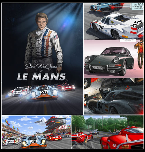 Bande Dessinée - Steve McQueen in Le Mans Adaptée du film "Le Mans" - Auteur : Sandro Garbo Illustrations et couleurs Florian Afflerbach, Jared Barel, Julien Dejeu, Sandro Garbo, Thomas Lebeltel, Guillaume Lopez, Pierre Ménard Dimensions : 35 x 26 cm - 64 pages Edition Hommage - Année 2016 34,95 € TTC / Incl. Taxes