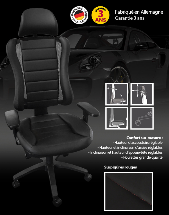 Fauteuil de Bureau Headpoint RS - Noir Basalte Réglage synchrone de l'inclinaison de l'assise et du dossier - système de fixation en continu Conçu pour une durée d'assise très longue Avec appuie-tête et accoudoirs réglables Dossier en résille et rembourré pour un soutien optimal du dos Assise galbée réglable en hauteur - Revêtements simili cuir Piétement étoile avec 5 roulettes doubles Poids : 19kg - LxHxP : 50 x 121/150 x 48 cm Made in Germany - Garantie 3 ans