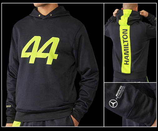 Hoodie mixte Lewis Hamilton Mercedes-AMG F1 Matière 75% Polyester / 25% Coton - Couleur Noir / Jaune Capuche réglable doublée en jersey - 2 poches latérales Mercedes 701227116-001 94,95 € TTC / Incl. Taxes