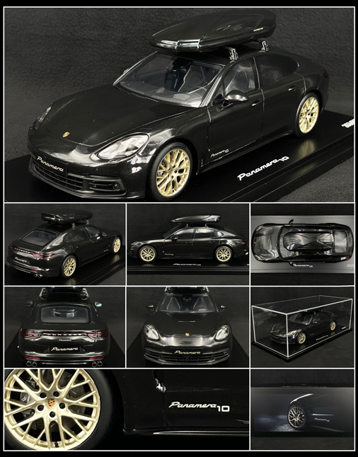 Ce modèle anniversaire présente de nombreuses spécificités comme les jantes en or blanc satiné ou le monogramme « Panamera 10 » sur les portes avant. Redécouvrez cette édition unique au 1/18e grâce à une superbe miniature de chez Spark, disponible en édition limitée, avec un coffre de toit entièrement amovible.