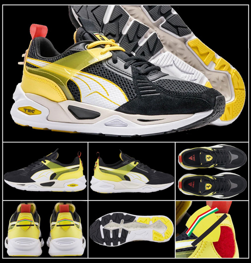 Chaussures homme Ferrari TRC Blaze by Puma Matière Mesh / Simili cuir / Caoutchouc - Semelle épaisse amorti spécial confort Talon et bout renforcés - Couleur Noir / Blanc / Jaune Puma 307322-01 139,95 € TTC / Incl. Taxes