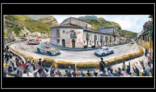 Affiche Porsche Targa Florio Reproduction d'une aquarelle originale de Uli Ehret Sur toile avec cadre en bois noir, protection UV, poussière et humidité Edition exclusive - Format 50 x 150 cm 379,95 € TTC / Incl. Taxes