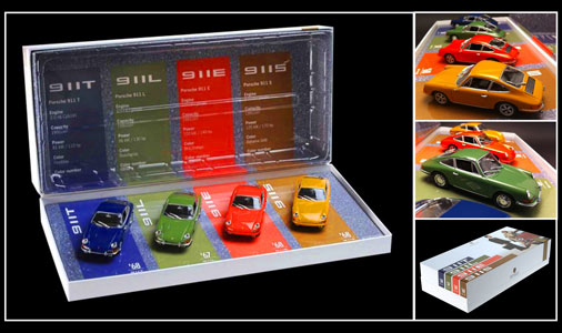 Set de 4 Porsche 911 Classic 911 T (1968) 110 cv, couleur bleu « Ossi », production : 343 exemplaires 911 L (1967) 130 cv, couleur vert feuillage, production : 7200 exemplaires 911 E (1968) 140 cv, couleur orange mandarine, production : 954 exemplaires 911 S (1968) 170 cv, couleur Jaune Bahama, production 1492 exemplaires Documentation en Anglais et Allemand ainsi qu’un certificat d’authenticité inclus 1/43 - Minichamps 433001968 Edition limitée - 911 exemplaires numérotés 279,95 € TTC / Incl. Taxes