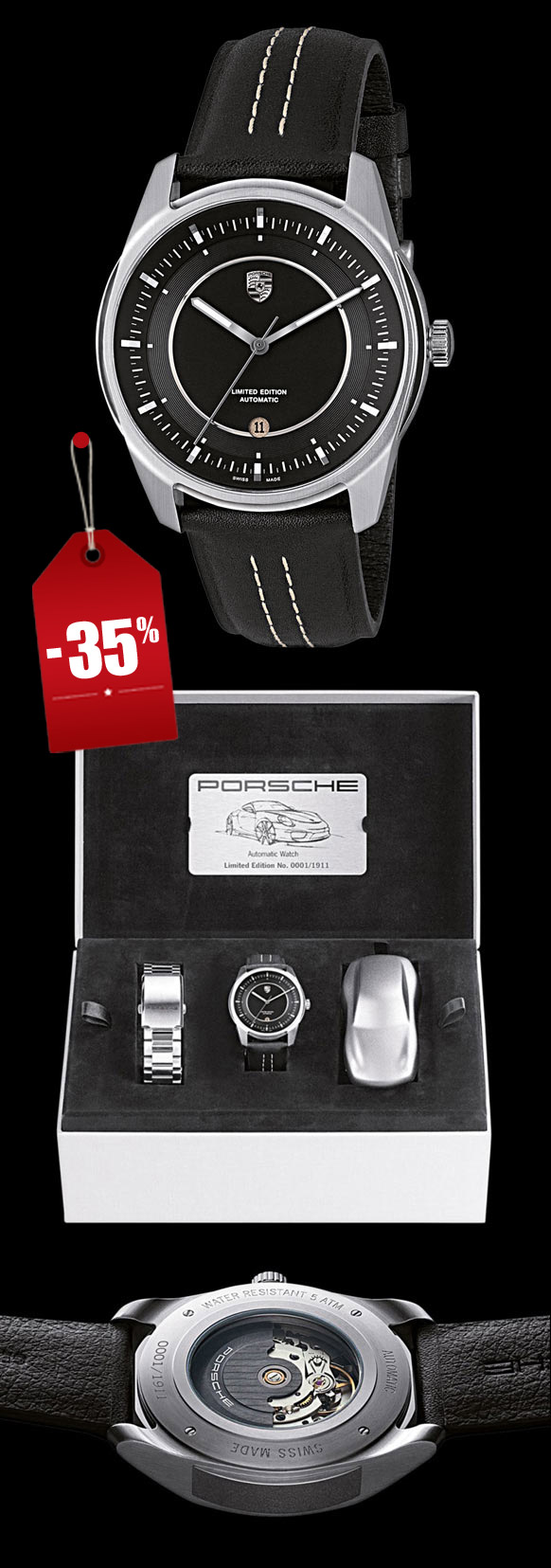 Montre automatique Porsche Design Premium Classic Boîtier en acier inoxydable satiné Cadran en métal brossé noir Bracelet en cuir de vachette haut de gamme Bracelet interchangeable en acier inoxydable Verre minéral saphir traité antireflets - Boîtier étanche 5 ATM Diamètre : 42 mm - Fabriqué en Suisse - Garantie 2 ans Série limitée à 1 911 exemplaires numérotés Porsche Design WAP0701000G