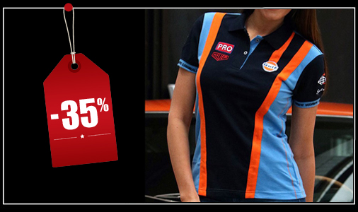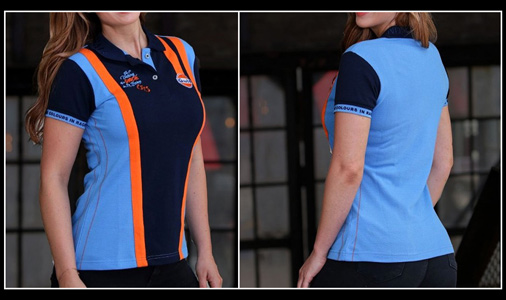 Polo femme Gulf Racing Team Matière : 65% coton, 35% Polyester Couleur : bleu marine / orange / bleu cobalt
