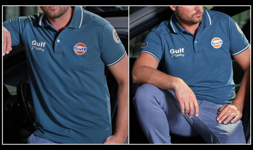 Polo homme Gulf Victoire Le Mans Matière 65% coton / 35% polyester Couleur bleu pétrole / filets blancs 79,90 € TTC / Incl. Taxes