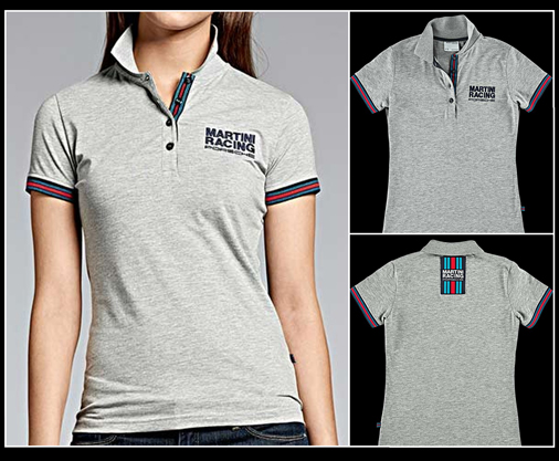 Polo Femme Porsche Martini Racing - Tailles S & M seulement Matière 47,5 % coton / 47,5 % polyester / 5 % élasthanne Couleur gris / bandes Martini - Porsche WAP921