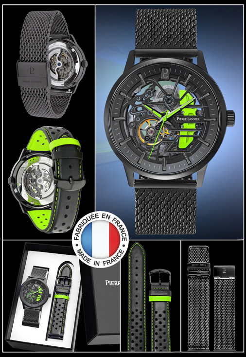 Coffret Montre automatique Pierre Lannier Paddock Fond cadran squelette - Représentation d'un étrier de frein - Boitier en acier inoxydable noir Bracelet interchangeable en cuir ou en acier milanais - Verre antireflets saphir Couleur Noir / Vert - Etanche à 50 mètres - Diamètre 43 mm - Garantie 2 ans Made in France - Pierre Lannier 385C479 299,95 € TTC / Incl. Taxes