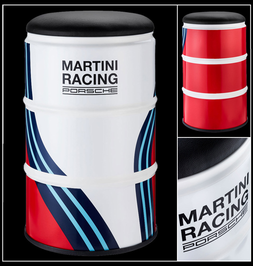 Siège Porsche Martini Racing Réplique d'un baril de pétrole - Utilisation en intérieur ou en extérieur Assise rembourrée - Revêtement simili cuir - Tonneau en métal Hauteur 60 cm - Diamètre 40 cm - Poids 10 kg Made in Germany - Porche WAP0501060PSFS
