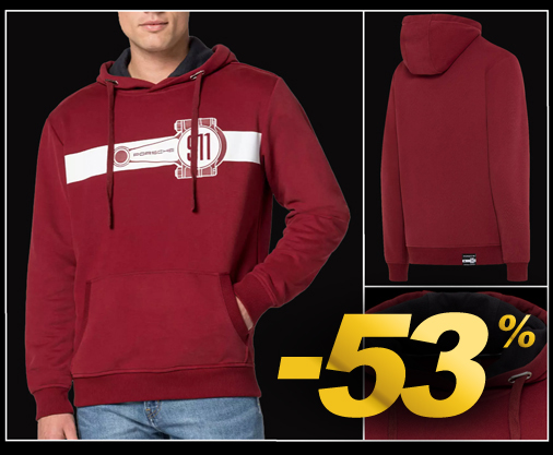 Hoodie homme Porsche 911 Bielle Capuche douce, doublée et réglable par cordon de serrage - Poche kangourou Matière : 65% coton / 35% polyester - Taille et manches côtelées Couleur Rouge Bordeaux - Porsche WAP673PESS