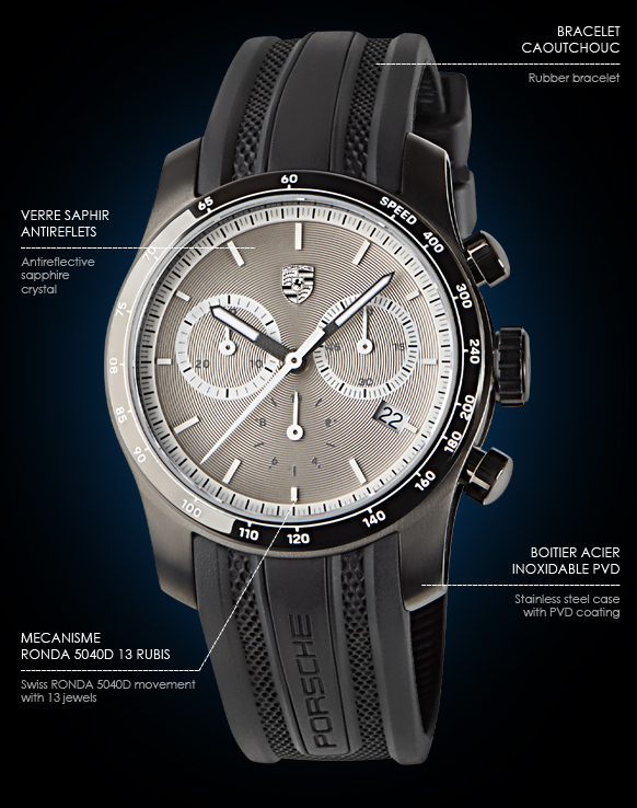 Montre Chrono Porsche 911 Collection Mouvement Suisse Ronda 5040D avec 13 rubis - Boîtier acier inoxydable revêtement PVD Bracelet en caoutchouc - Verre saphir antireflet simple face Fonctions date, chronographe et tachymètre - Aiguilles luminescentes Boucle ardillon / revêtement PVD - Etanche à 100 mètres / 10 ATM Diamètre : 38 mm - Epaisseur 10 mm - Garantie 2 ans Fabriqué en Suisse - Porsche WAP0709000K 699,95 € TTC / Incl. Taxes