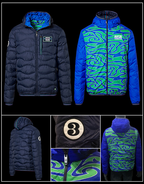 Veste réversible homme Porsche Martini 917 Collection Veste matelassée réversible avec capuche - Matière 100% nylon / polyester Couleur bleu foncé / bleu cobalt / vert psychédélique Détails inspirés de la Porsche 917 LH Le Mans 1970 n° 3 Badge avec numéro 3 sur la manche - Pins 917 et bandes tricolores Porsche WAP559LMRH 229,95 € TTC / Incl. Taxes