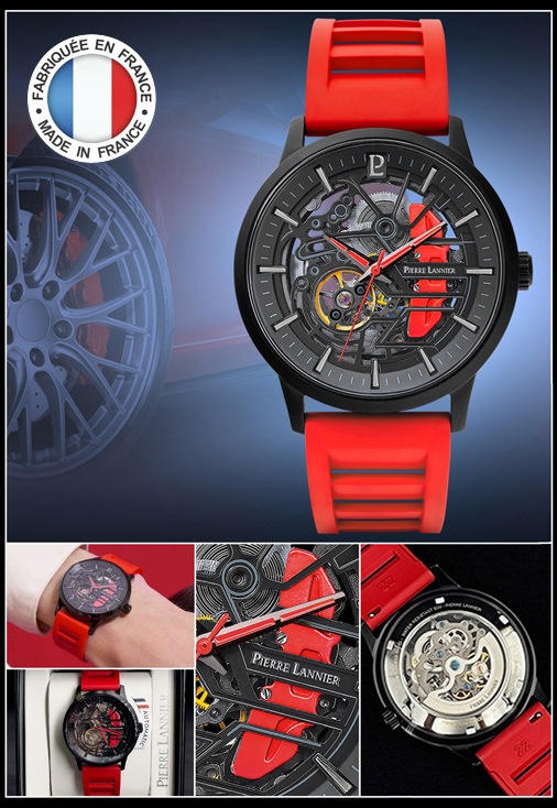Montre Automatique Pierre Lannier Mouvement automatique 3 aiguilles - Boitier en acier inoxydable noir - Verre antireflets saphir Bracelets longueur 127 x 80 mm / largeur 22 mm - Fermoir Boucle Ardillon Etanche à 50 mètres - Diamètre 43 mm - Epaisseur 12,3 mm Bracelet silicone de qualité avec boucle coulissante sécurisée Fond cadran squelette - Représentation d'un étrier de frein Fabrication française - Garantie 2 ans - Pierre Lannier 341A499 279,95 € TTC / Incl. Taxes