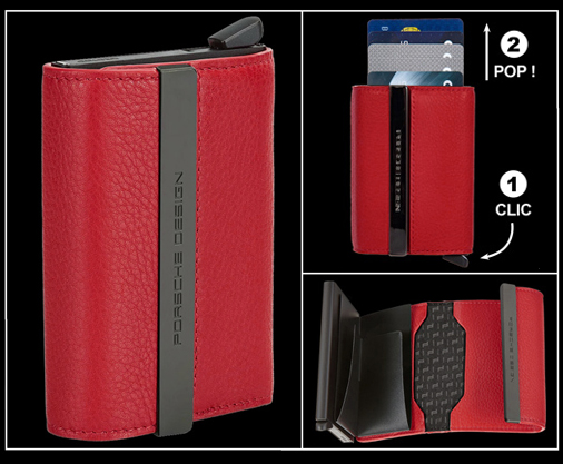 Portefeuille / Porte-cartes Cuir Porsche Design Pop Up X Secrid Mécanisme d'extraction de 4/6 cartes en un seul mouvement - Couleur Rouge Carmin Dimensions fermées 6,5 x 9,5 x 2 cm - Dimensions ouvertes 23,5 x 10 cm Protection de bloqueur RFID - Matière 100% Cuir de vache Monogramme Porsche Design gravé sur la plaque en bronze Porsche Design - OSE09800.001 124,95 € TTC / Incl. Taxes