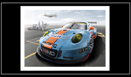 Poster Porsche 997 GT3 RSR Gulf avec avion Mustang P-51 Dimension du poster : 29.7 x 42 cm - Dimension de l'image : 26.5 x 39 cm 9,95 € TTC / Incl. Taxes