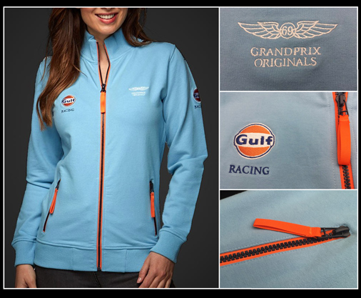 Veste zippée femme Gulf - Collectors Edition Porsche Gulf JWA Matière 95% coton 5% elasthanne - Qualité de coton premium Ecussons brodés manches / poitrine - 2 poches extérieures zippées Couleur bleu Gulf 99,90 € TTC / Incl. Taxes