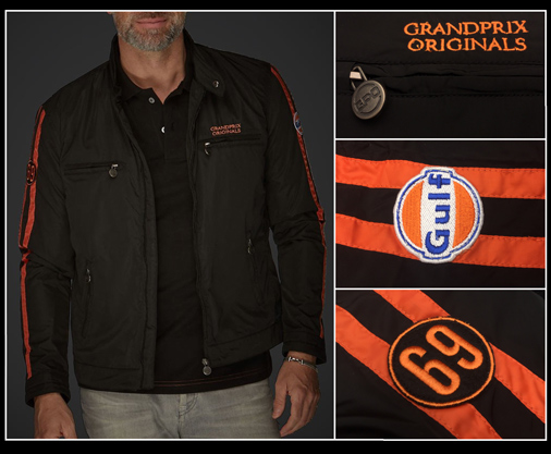 Veste homme Gulf Racing Coupe sportive courte col droit - Matière 100% Polyester Couleur noir / orange - Extémité des manches zippées et boutonnées 4 poches extérieures zippées - Poche intérieure zippée 129 € TTC / Incl. Taxes
