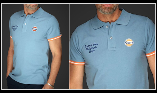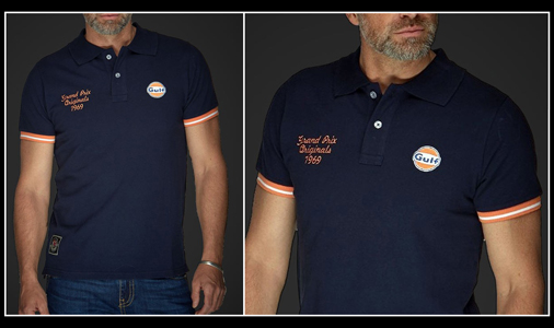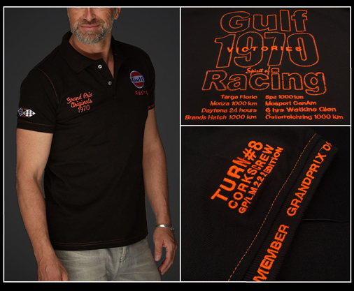Polo homme Gulf - Laguna Seca Corkscrew Ecusson brodé sur la poitrine - Surpiqûres sur les épaules Couleur noir / orange - Matère 65% coton / 35% polyester Broderie au dos Gulf Racing victories 79,90 € TTC / Incl. Taxes