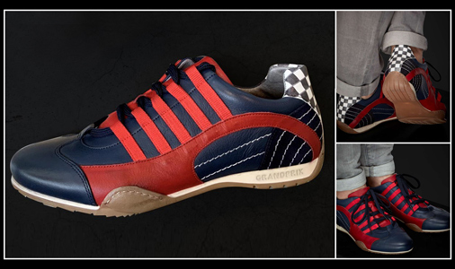 Chaussures pour homme Sport Sneaker Doublure et renforts cuir - Couleur bleu marine / rouge Livré avec 2 paires de lacets : bleu marine et rouge Matière 100% cuir / semelle caoutchouc 179 € TTC / Incl. Taxes