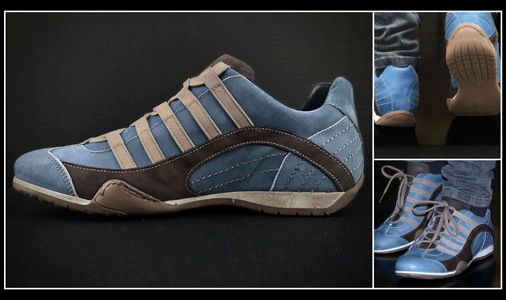 Chaussures pour homme Sport Sneaker Doublure et renforts cuir - Couleur bleu Pacifique / marron Livré avec 2 paires de lacets : bleu marine et rouge Matière 100% cuir / semelle caoutchouc 179 € TTC / Incl. Taxes
