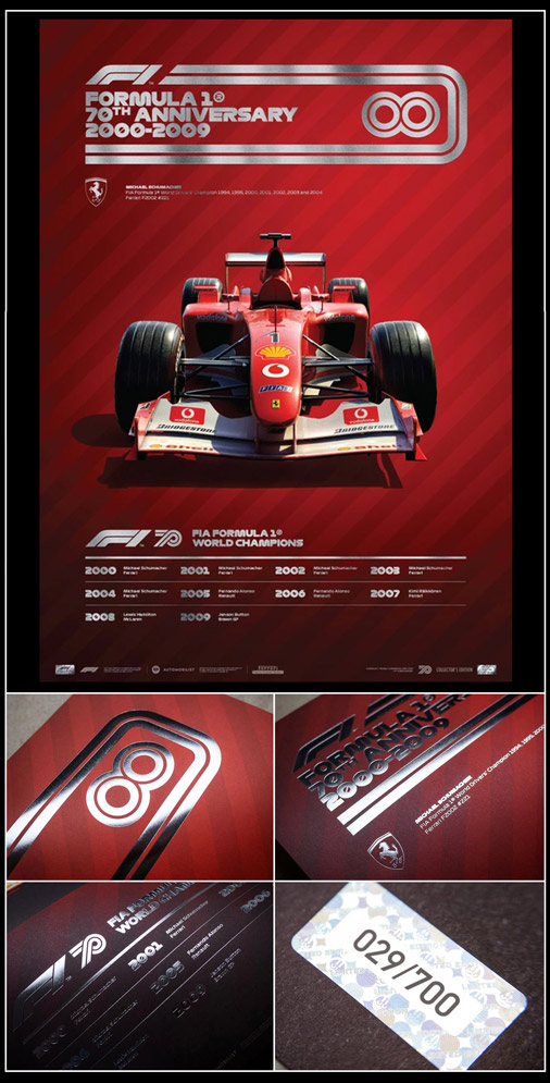 Poster Ferrari F1 - 70th anniversary 2000 / 2009 Luxury Edition - 50 x 70 cm - Impression sur papier 175g/m² Edition limitée - 700 exemplaires 119,95 € TTC / Incl. Taxes