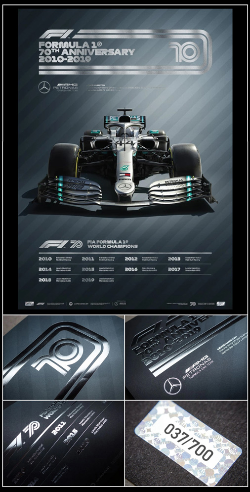 Poster Mercedes AMG Petronas F1 - 70th anniversary 2010 / 2019 Luxury Edition - 50 x 70 cm - Impression sur papier 175g/m² Edition limitée - 700 exemplaires 119,95 € TTC / Incl. Taxes