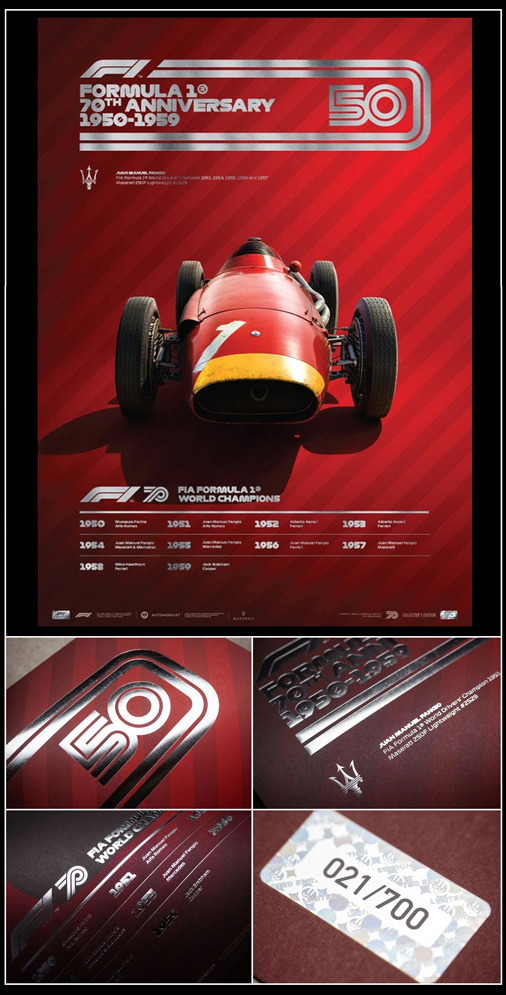 Poster Maserati F1 - 70th anniversary 1950 / 1959 Luxury Edition - 50 x 70 cm - Impression sur papier 175g/m² Edition limitée - 700 exemplaires 119,95 € TTC / Incl. Taxes