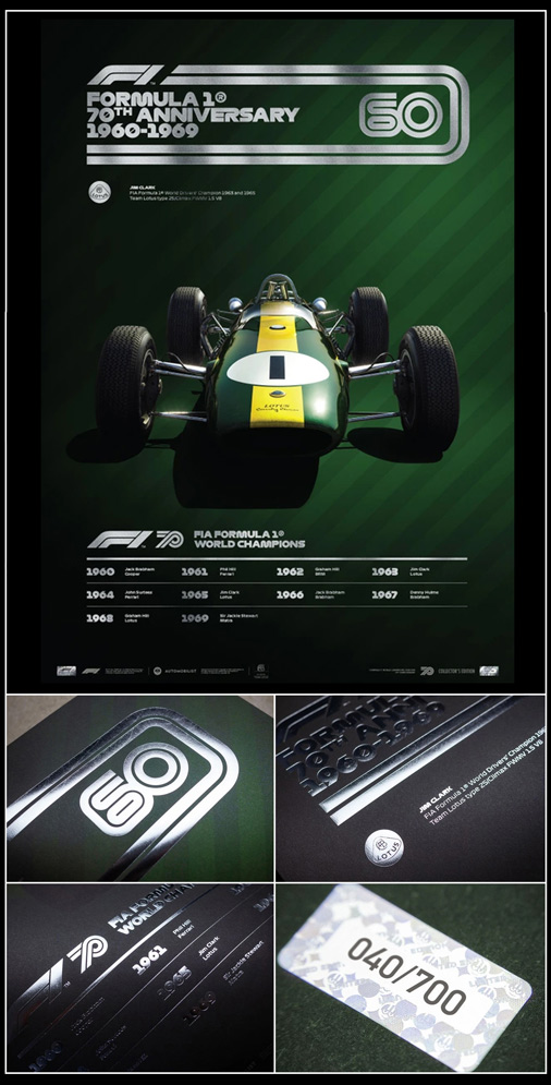 Poster Lotus F1 - 70th anniversary 1960 / 1969 Luxury Edition - 50 x 70 cm - Impression sur papier 175g/m² Edition limitée - 700 exemplaires 119,95 € TTC / Incl. Taxes