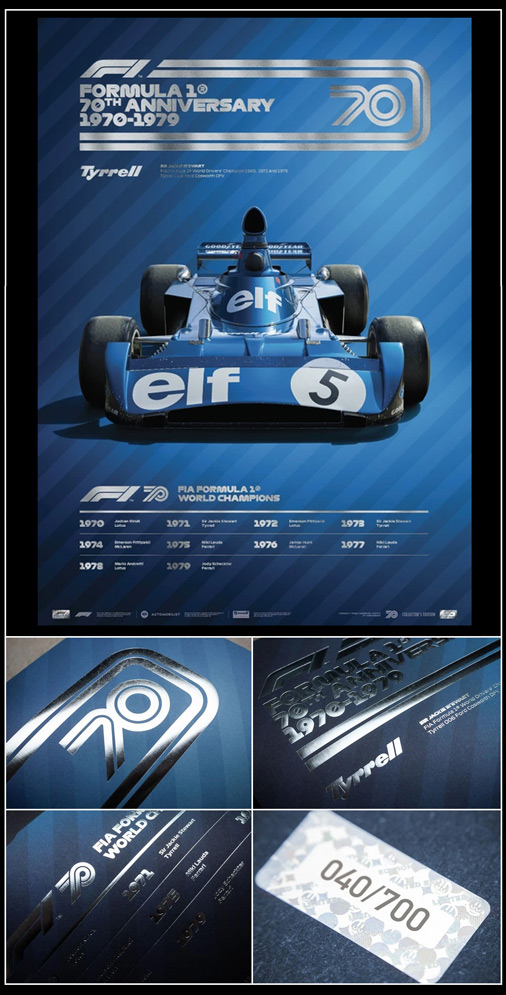 Poster Tyrrell F1 - 70th anniversary 1970 / 1979 Luxury Edition - 50 x 70 cm - Impression sur papier 175g/m² Edition limitée - 700 exemplaires 119,95 € TTC / Incl. Taxes
