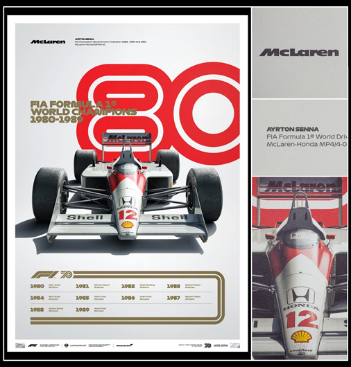 Poster McLaren F1 - World champions 1980 / 1989 50 x 70 cm - Impression sur papier 175g/m² Edition limitée - 1980 exemplaires 49,95 € TTC / Incl. Taxes