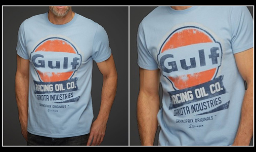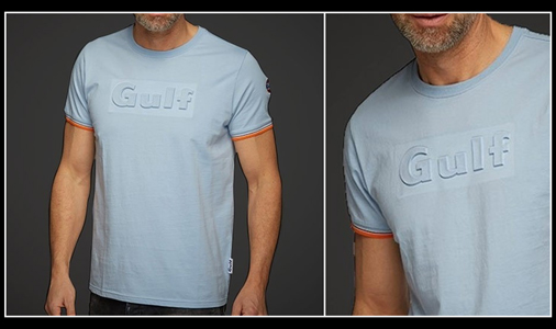 T-shirt Homme Gulf Racing Oil Company Logo Gulf en relief sur le devant - Matière 100% coton Logo brodé Gulf sur la manche - Couleur bleu gulf Bords cote Gulf noir et orange sur les manches 39,90 € TTC / Incl. Taxes