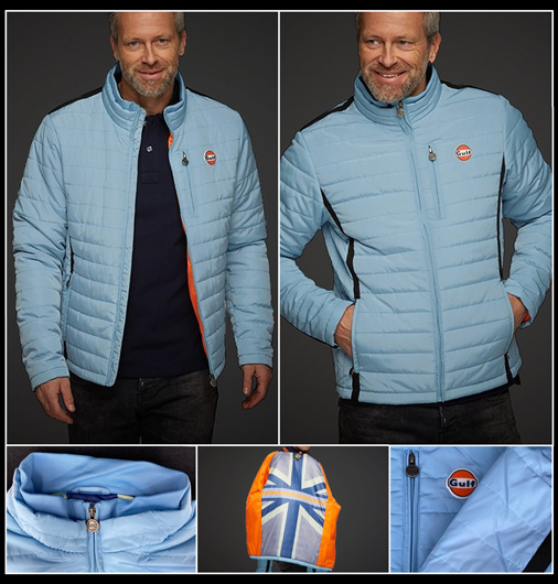 Veste matelassée Homme Gulf Performance Col double - Couleur bleu Gulf / Bandes noires - Matière 100% Polyester Doublure Union Jack assortie - Fermeture éclair Logo caoutchouc Gulf sur la poitrine 119 € TTC / Incl. Taxes