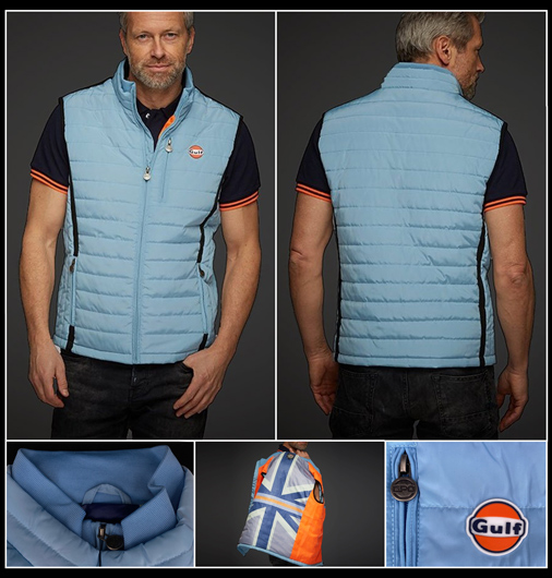 Veste matelassée sans manche Homme Gulf Performance Col double - Couleur bleu Gulf / Bandes noires - Matière 100% Polyester Doublure Union Jack assortie - Fermeture éclair Logo caoutchouc Gulf sur la poitrine 89,90 € TTC / Incl. Taxes