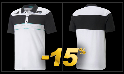 Polo homme Mercedes-AMG Petronas F1 by Puma Matière : 52% Coton / 42% Polyester - Couleur : Blanc / Noir / Vert Puma 534892-03
