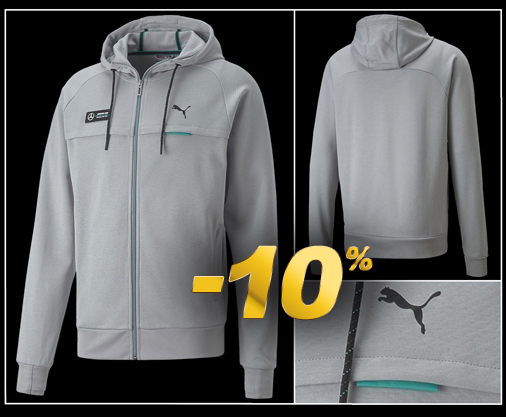 Hoodie homme Mercedes-AMG Petronas F1 by Puma Fermeture par zip - Capuche réglable par cordon de serrage - 2 Poches latérales Matière 60% Coton / 40% Polyester - Couleur : Gris Puma 534906-02