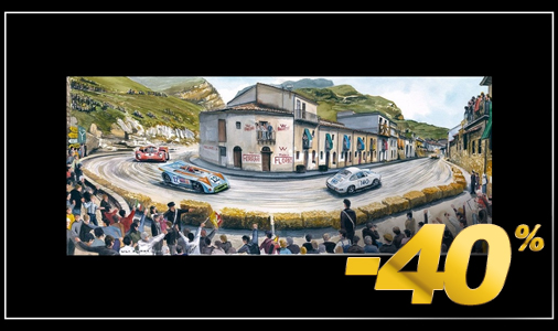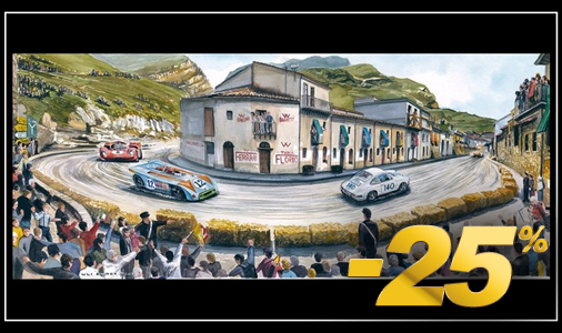 Affiche Porsche Targa Florio Reproduction d'une aquarelle originale de Uli Ehret Sur toile avec cadre en bois noir, protection UV, poussière et humidité Edition exclusive - Format 50 x 150 cm
