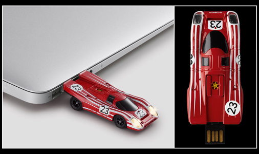 Clé USB Porsche 917 K n°23 - Vainqueur 24h du Mans 1970 Capacité de stockage 8 Go - Voyants de contrôle style phare Bouton poussoir sous la clé pour sortir l’embout Couleur blanc / rouge 1/64 - Porsche Design WAP0500720G
