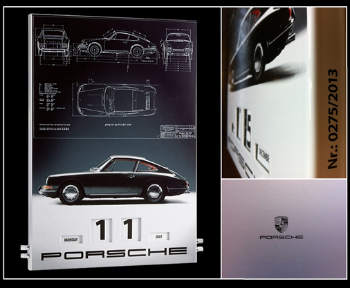 Calendrier Perpetuel Porsche 911 1963 Inspiré des plans initiaux de la 911 - Jours et mois en anglais et allemand Matière : métal émaillé - Dimensions : 43,5 x 33,5 Edition limitée - 2013 exemplaires numérotés Porsche Design WAP0920020E 199,95 € TTC / Incl. Taxes