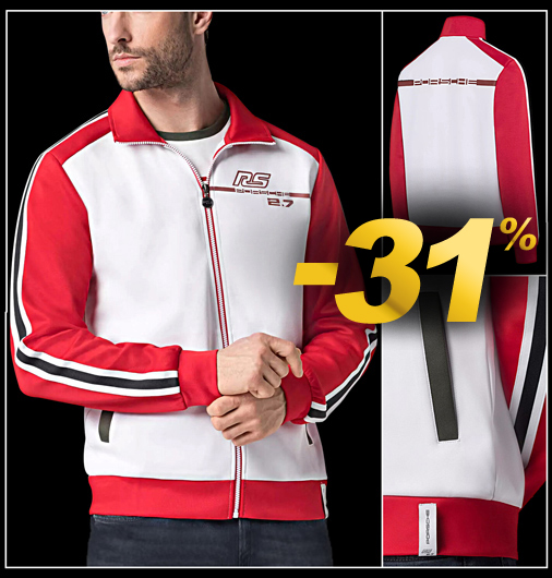Veste homme Porsche RS 2.7 - Tailles XS / M / XL seulement Couleur blanc / rouge / détails noir - Matière 95 % polyester / 5 % élasthanne Col montant - 2 poches latérales - Fermeture zippée Porsche WAP953NRS2
