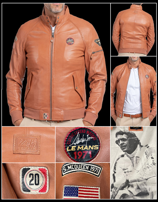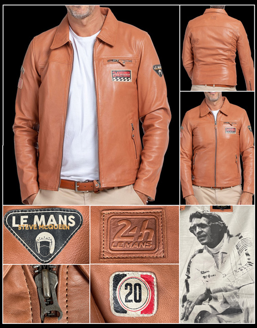 Veste en cuir homme Steve McQueen 24h Le Mans Matière : 100% cuir d'agneau de qualité - Doublure : 100% coton Intérieur complet à l'effigie de Steve McQueen Nombreux détails surpiqués - Couleur : Havane