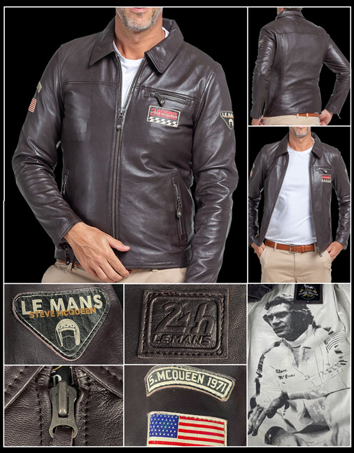 Veste en cuir homme Steve McQueen 24h Le Mans Matière : 100% cuir d'agneau de qualité - Doublure : 100% coton Intérieur complet à l'effigie de Steve McQueen Nombreux détails surpiqués - Couleur : marron