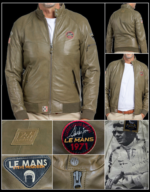 Veste en cuir homme Steve McQueen 24h Le Mans Matière : 100% cuir d'agneau de qualité - Doublure : 100% coton Intérieur complet à l'effigie de Steve McQueen Nombreux détails surpiqués - Couleur : Kaki