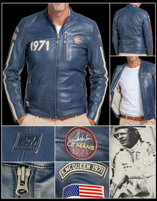 Veste en cuir homme Steve McQueen 24h Le Mans Matière : 100% cuir d'agneau de qualité - Doublure : 100% coton Intérieur complet à l'effigie de Steve McQueen Nombreux détails surpiqués - Couleur : Bleu