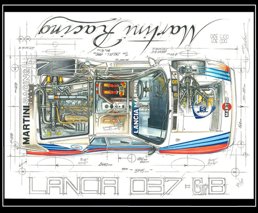Reproduction d'un dessin original de Sébastien Sauvadet Lancia Rally 037 Martini 30 x 40 cm - Papier 300 g/m2 39,95 € TTC / Incl. Taxes