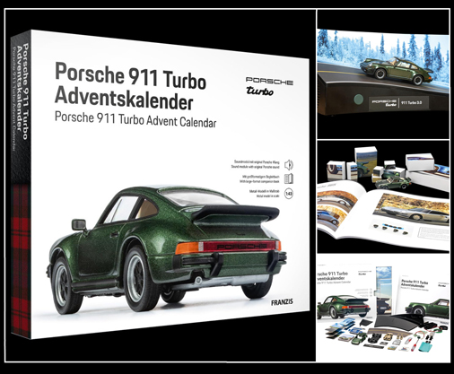Calendrier de l'Avent - Porsche 911 Turbo 3.0 1977 Calendrier de l’Avent en 24 étapes - Kit en métal, assemblage possible sans colle Socle avec module sonore intégré : Son original d'un moteur Porsche Grand Livret d'accompagnement de 52 pages en Anglais / Allemand Miniature Porsche 911 Turbo 3.0 1977 - Vert Chêne 1/43 Requiert 2 piles 1,5 V (AA) non-incluses Franzis 67233 69,95 € TTC / Incl. Taxes