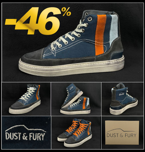 Chaussures homme Dust & Fury Matière Toile / Cuir - Doublure Cuir / Textile - Semelle Cuir / Caoutchouc - Couleur Bleu Finition vieillie Finish Line - Fabriquées à la main en Union Européenne 2 paires de lacets Blanc / Orange