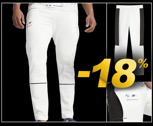 Pantalon homme BMW Motorsport 2 poches latérales - Taille côtelée et réglable par cordon de serrage Matière 100% coton - Couleur Blanc Puma 621223-02