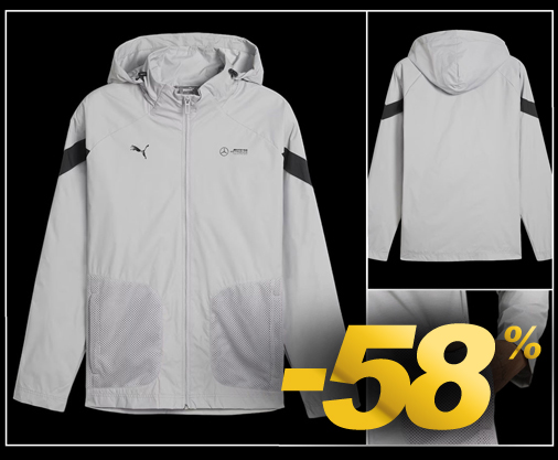 Veste imperméable homme Mercedes-AMG F1 Matière 100% Polyamide - 2 Couleurs disponibles - Capuche réglable Fermeture zippée - 2 poches latérales Puma 623739
