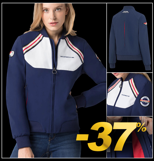 Veste femme Porsche Rothmans Racing Style Fermeture par zip - 2 poches latérales - 1 poche intérieure zippée Couleur : Bleu / Blanc / Rouge - Matière : 100% Nylon Porsche WAP454NRTM